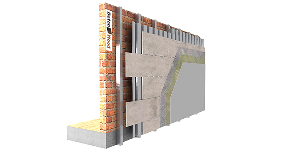 Sistema per controparete esterna in BetonWood e FiberTherm su muratura caratterizzata da fibra di legno tipo FiberTherm per l'isolamento termico e di pannelli in cementolegno avvitato su legno.![]()