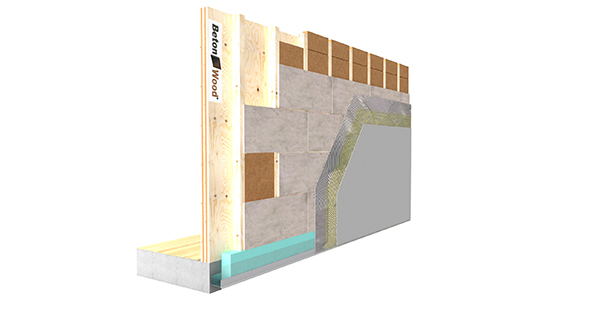 Sistema per controparete esterna in BetonWood su legno caratterizzato da pannelli in cementolegno BetonWood avvitato su legno, rasante, rete e accessori.![]()
